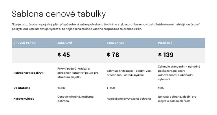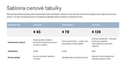 Cenová tabulka pro stránku s nabídkou Šablona HTML