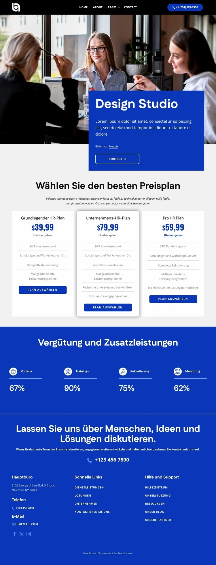 Wenn Sie HTML Builder verwenden, können Sie Farben, Schriftarten, Kopf- und Fußzeilen, Layout, Spalten und andere Designelemente sowie Inhalte und Bilder anpassen.