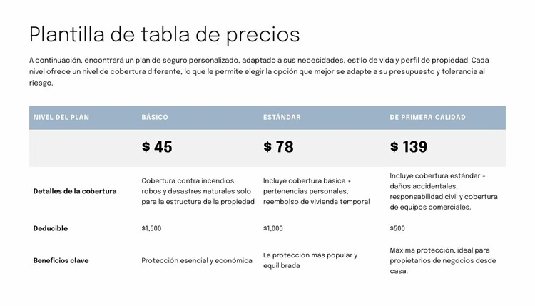 Tabla de precios para la página de propuesta Plantilla HTML5