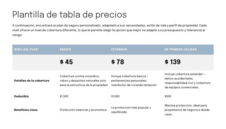 Tabla de precios para la página de propuesta Plantilla de sitio web
