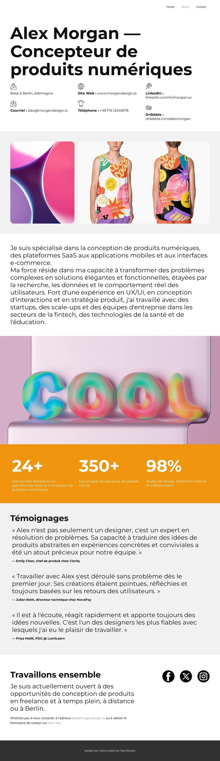 Lorsque vous utilisez Générateur de modèles d'une page, vous pourrez ajuster les couleurs, les polices, l'en-tête et le texte, la mise en page, les colonnes et autres éléments de conception, ainsi que le contenu et les images.