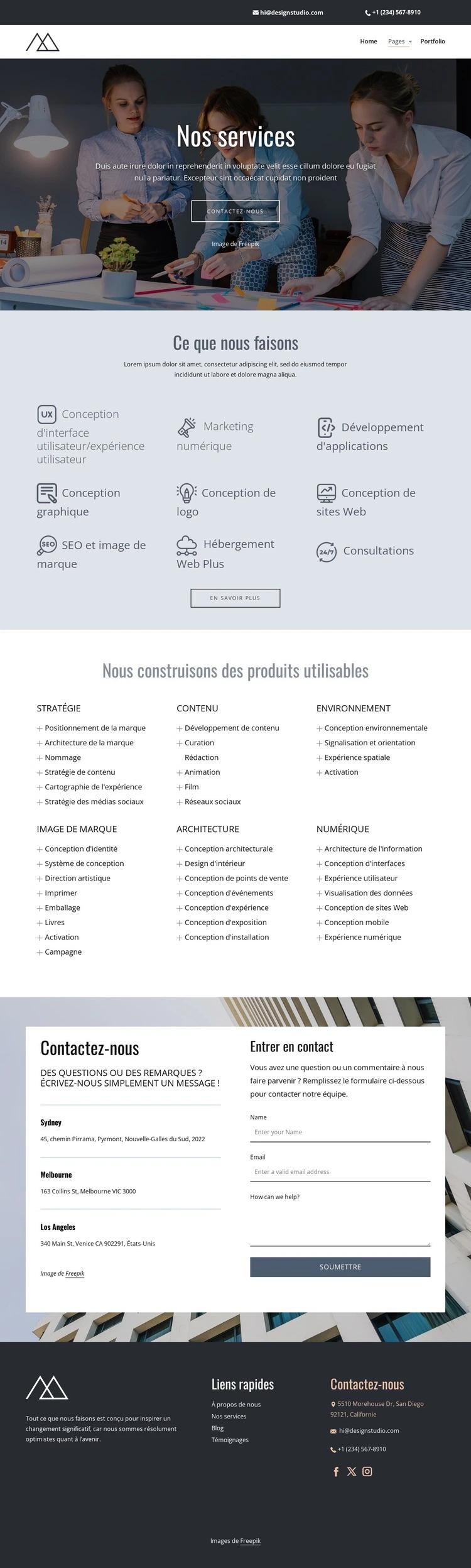 Lorsque vous utilisez Générateur de maquette de site Web, vous pourrez ajuster les couleurs, les polices, l'en-tête et le texte, la mise en page, les colonnes et autres éléments de conception, ainsi que le contenu et les images.