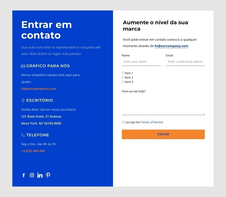 Ao usar o Construtor de Modelos, você poderá ajustar cores, fontes, cabeçalho e base, layout, colunas e outros elementos de design, bem como conteúdo e imagens.