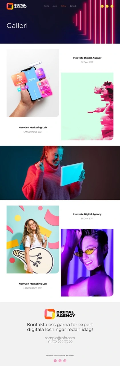 Skapa en professionell gratis webbplatsmall. Lyhörd, helt anpassningsbar med enkel Drag-n-Drop Nicepage-redigerare. Justera färger, teckensnitt, sidhuvud och sidfot, layout och andra designelement, samt innehåll och bilder.
